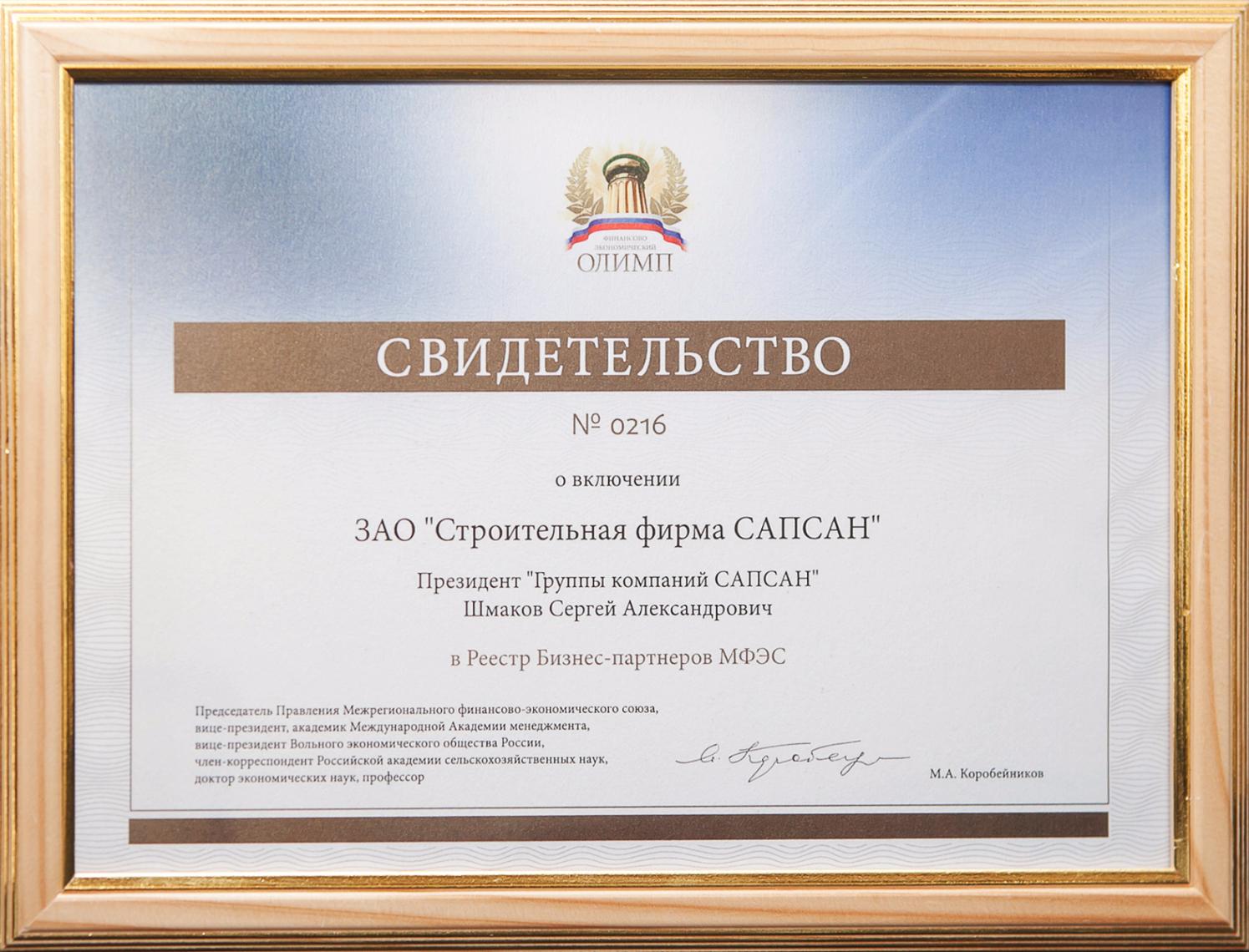 The Russian Economy Leaders Annual National Awards named its winners at the grand ceremony on October 27, 2006 in Moscow, at the President Hotel. The honorable status of a Leader of the Russian Economy was assigned to 83 companies of the Russian Federation with top performance during the previous year. SAPSAN Group of Companies was among the teams considered to have made a significant contribution to Russia's economic development. The winning companies were included in the register of the Chamber of Commerce and Industry of the Russian Federation and obtained the status of Reliable Business Partners.