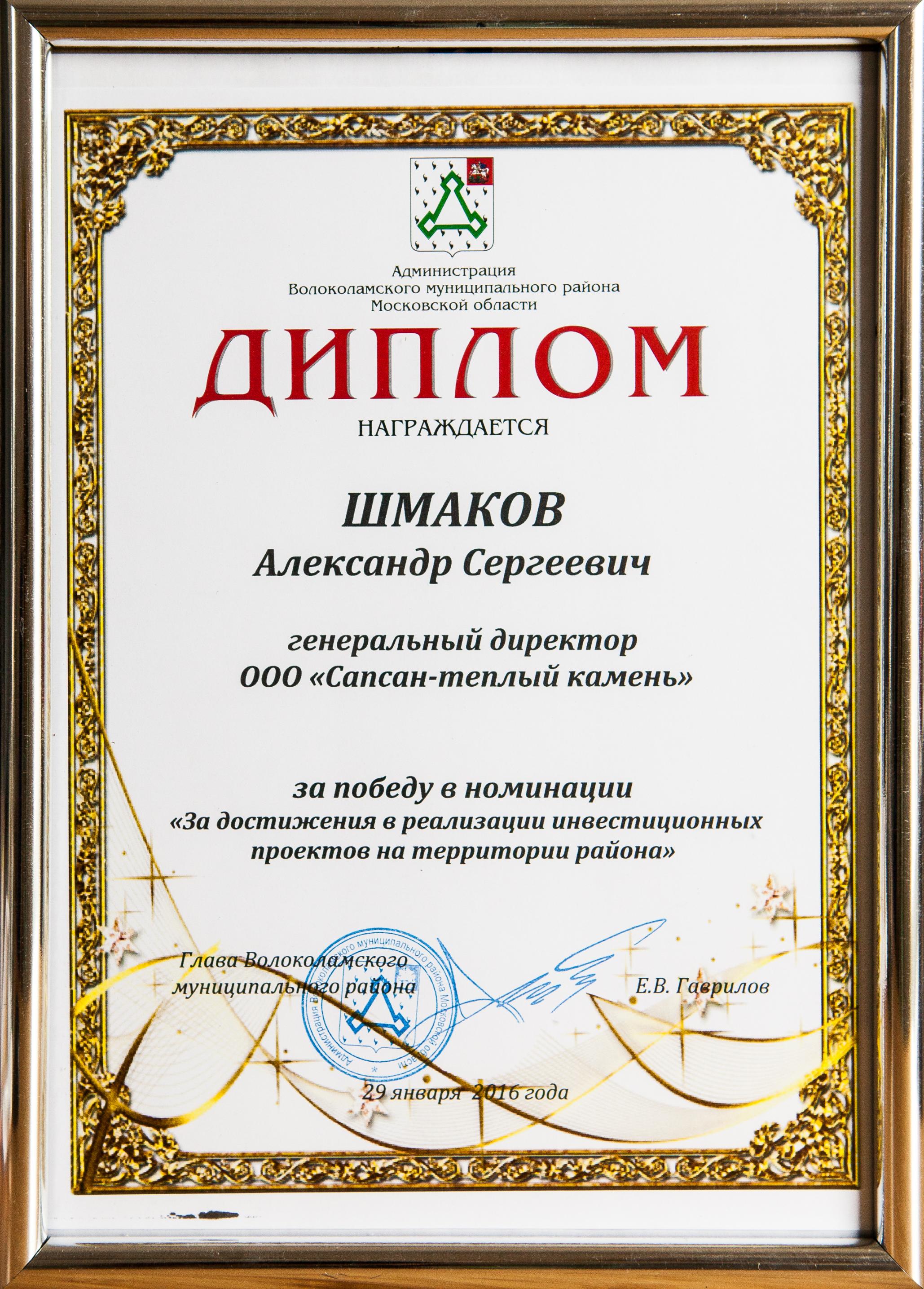 SAPSAN Tyoply Kamen factory. Alexander Shmakov, Director of Development at SAPSAN Group of Companies and Head of the SAPSAN Tyoply Kamen project, received the commemorative award for "Achievements in the Implementation of Investment Projects in Volokolamsk District".